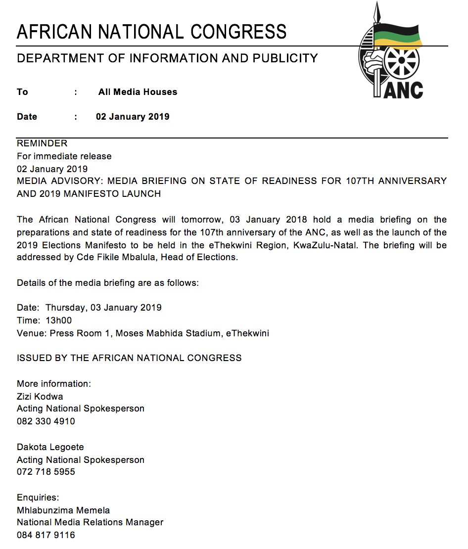 African National Congress On Twitter Media Advisory Media Briefing On State Of Readiness For 107th Anniversary And 2019 Manifesto Launch Details Of The Media Briefing Are As Follows Date Thursday 03 January